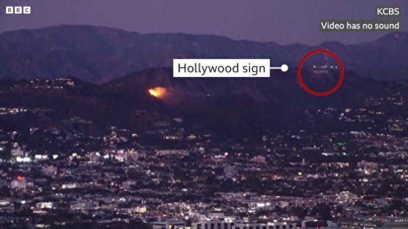 山火蔓延至好莱坞,图中红圈为好莱坞巨型标志。图源:BBC视频截图